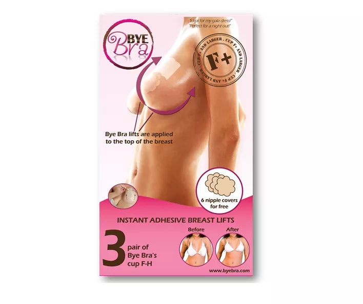 Bye Bra nepastebimi krūtinės lipdukai arba lipnios juostelės pakeliančios krūtis, kurios atitinka F, G arba H dydžio liemenėlės kaušelį (3 poros), pakuotėje kartu su vienkartinio naudojimo silikoniniais spenelių lipdukais (3 poros).
