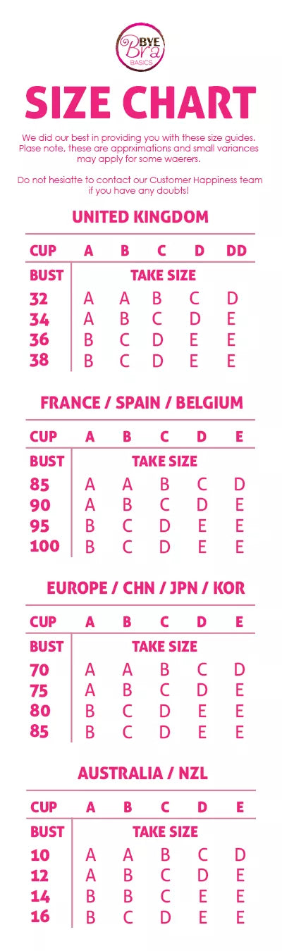 Bye Bra aukščiausios kokybės silikoninės liemenėlės gaminamos keturių dudžių A, B, C, D.