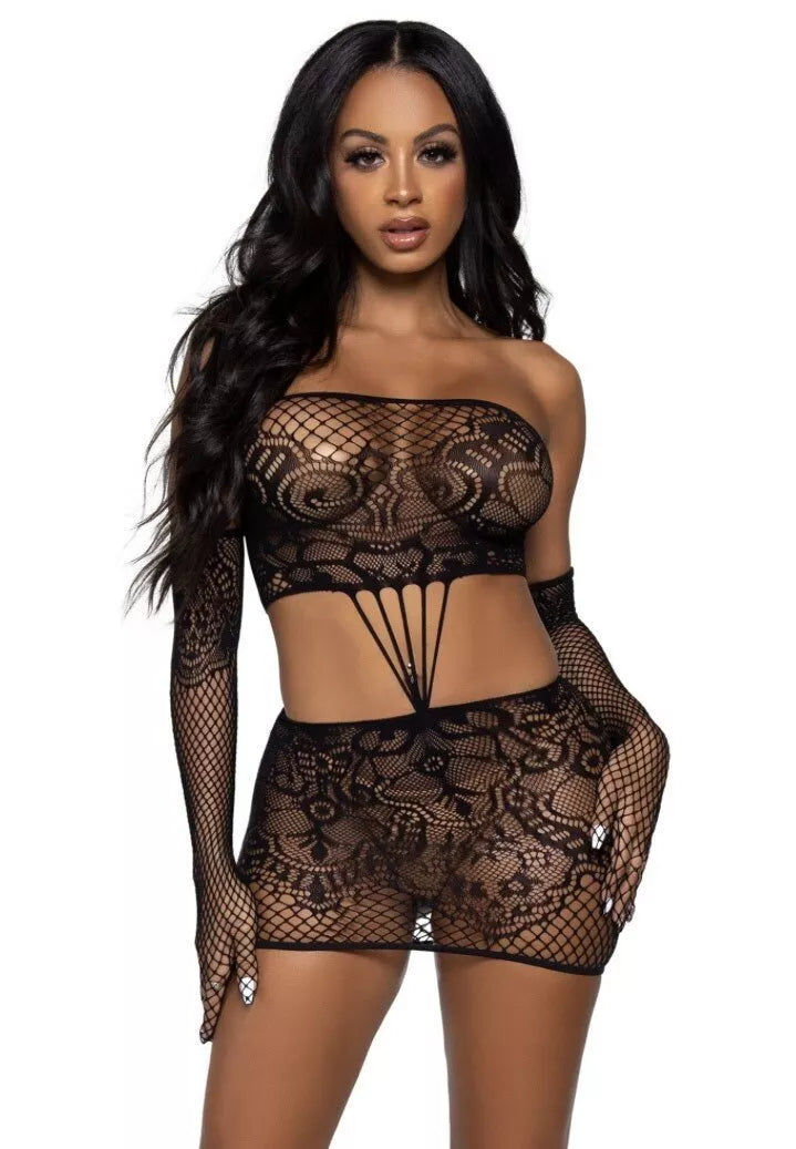 Leg Avenue juoda seksuali nėrinių suknelė ir pirštinės 86133