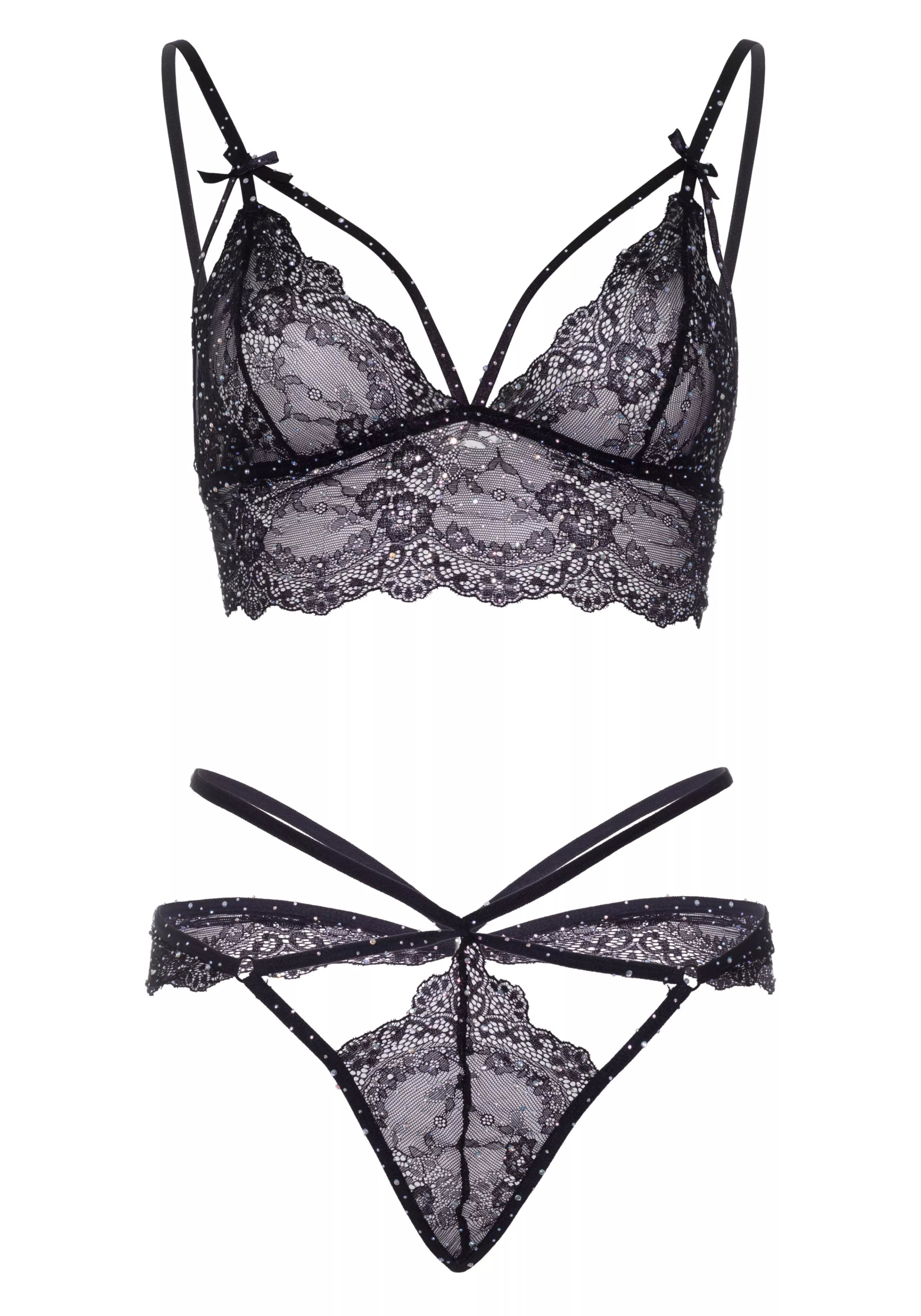Leg Avenue juodas seksualus blizgus komplektėlis, kurį sudaro seksuali braletės tipo liemėnėlė su stringais iš blizgaus erotiško audinio ir dirželių.... Skaityti daugiau