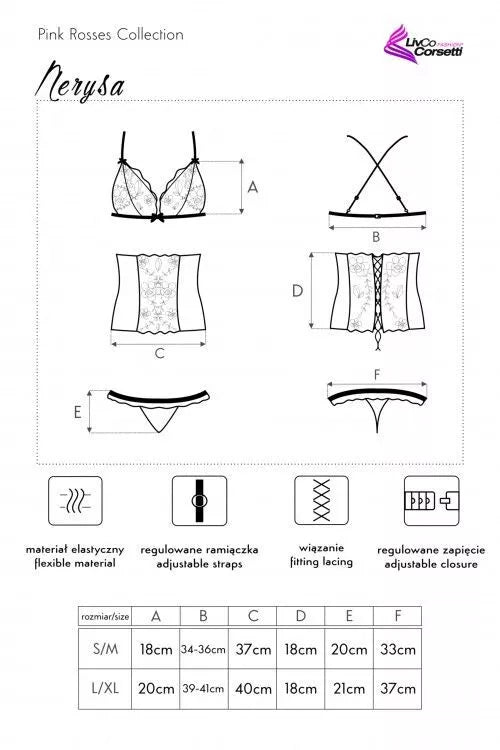 LivCo seksualus 3 dalių komplektas NERYSA, bordo spalvos dekoruotas neriniais, liemenėlė ant petnešėlių, kelnaitės stringų tipo, taippat komplekte korsetas. Sudėtis... Skaityti daugiau