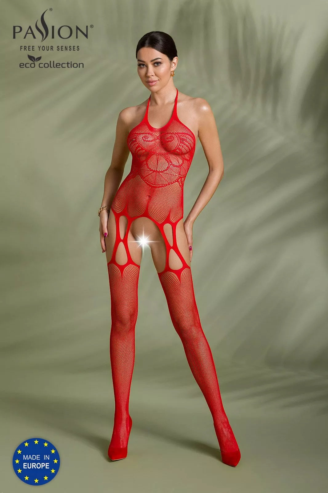 Nepaprastai seksuali vientisa, aukštos kokybės raudona viso kūno kojinė Passion ECO BS002 pagaminta iš antrinių žaliavų, be rankovių, su iškirpte tarpukojyje, dekoruota gėlių raštais. Vienas universalus dydis.