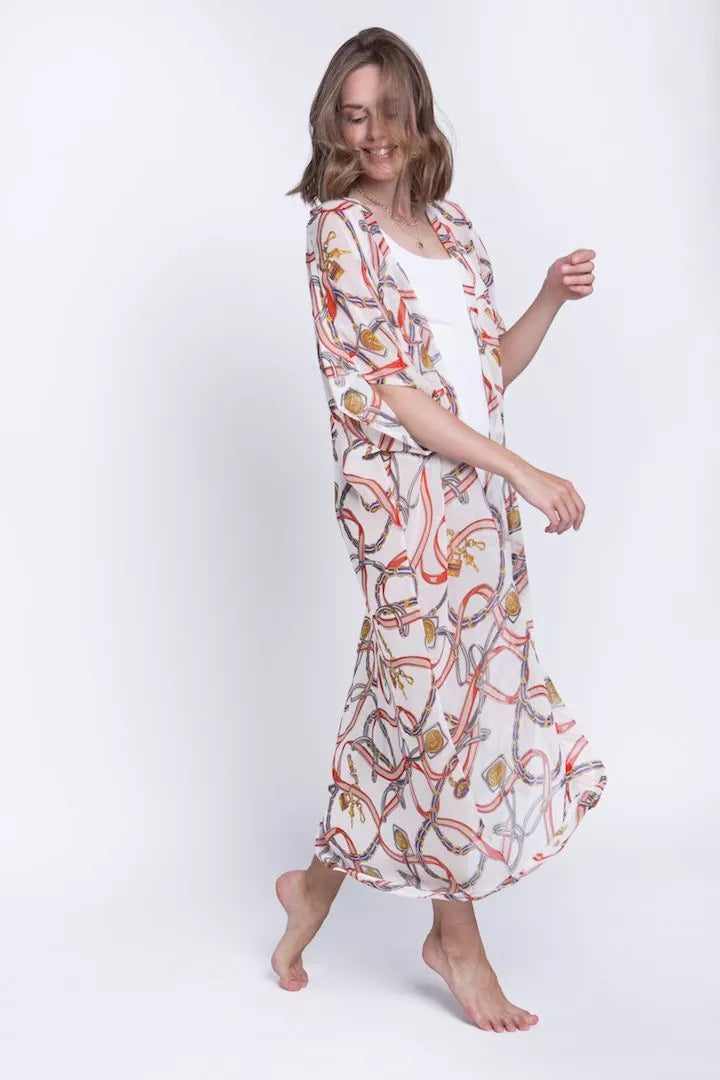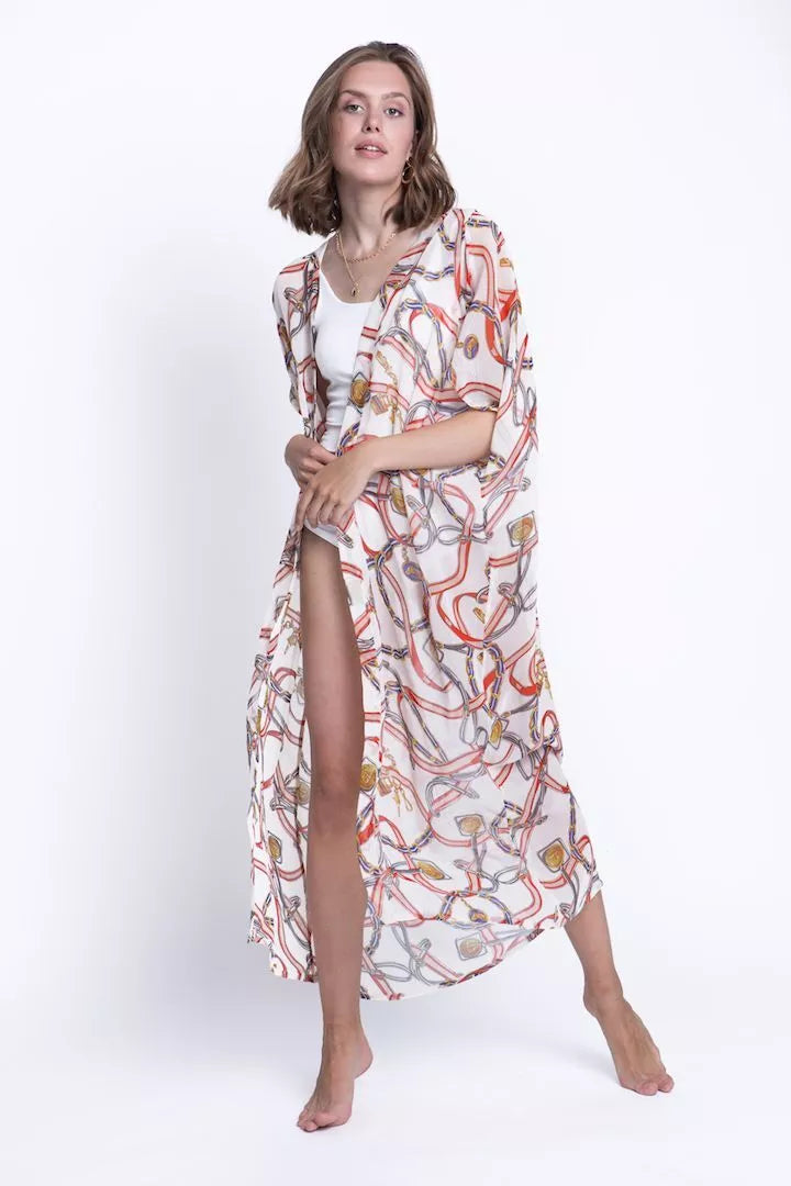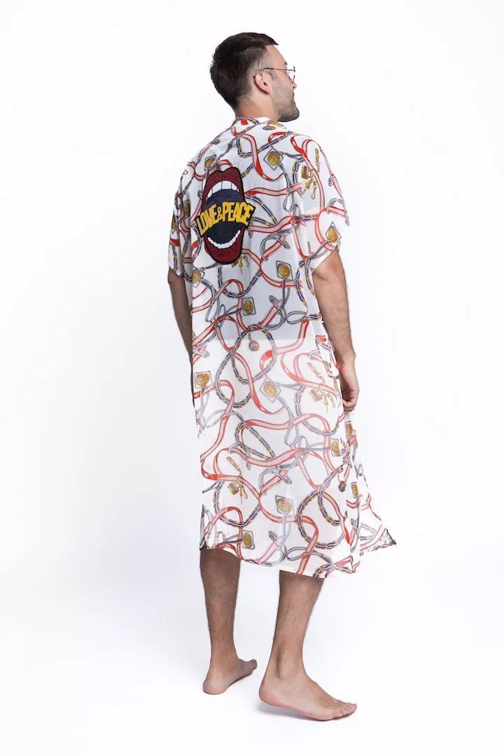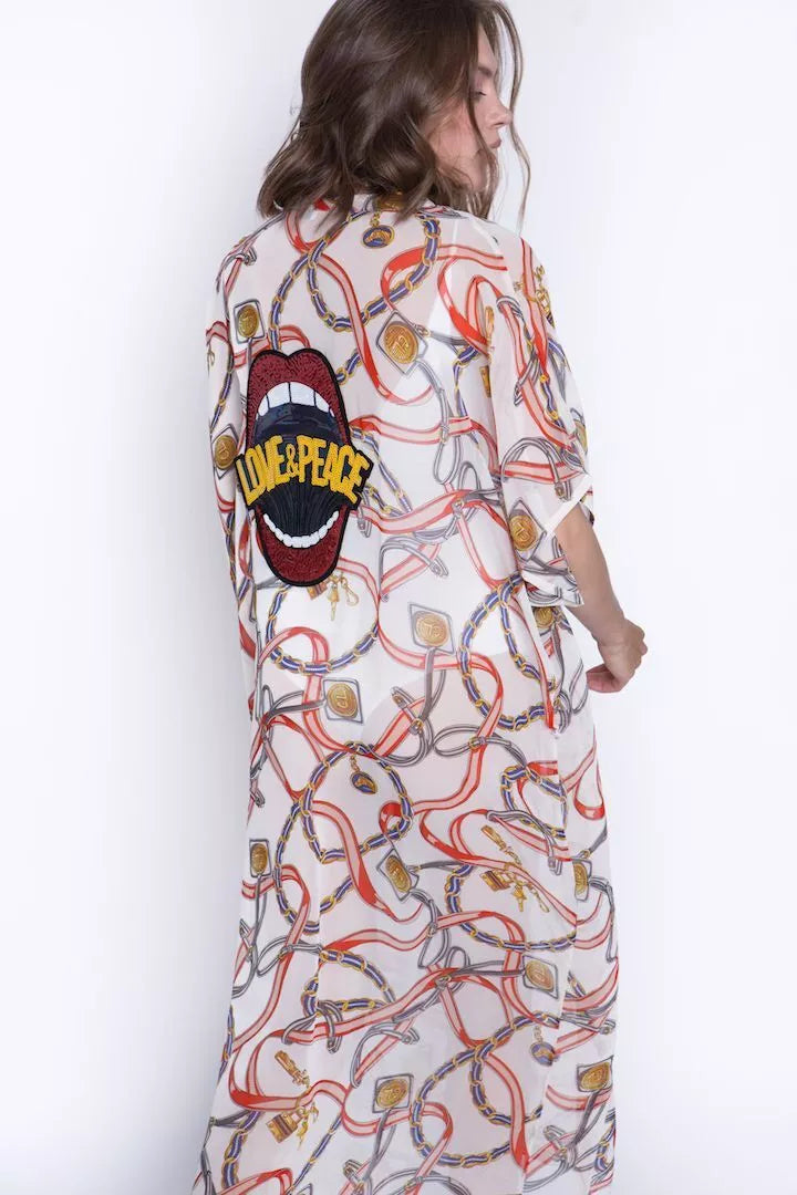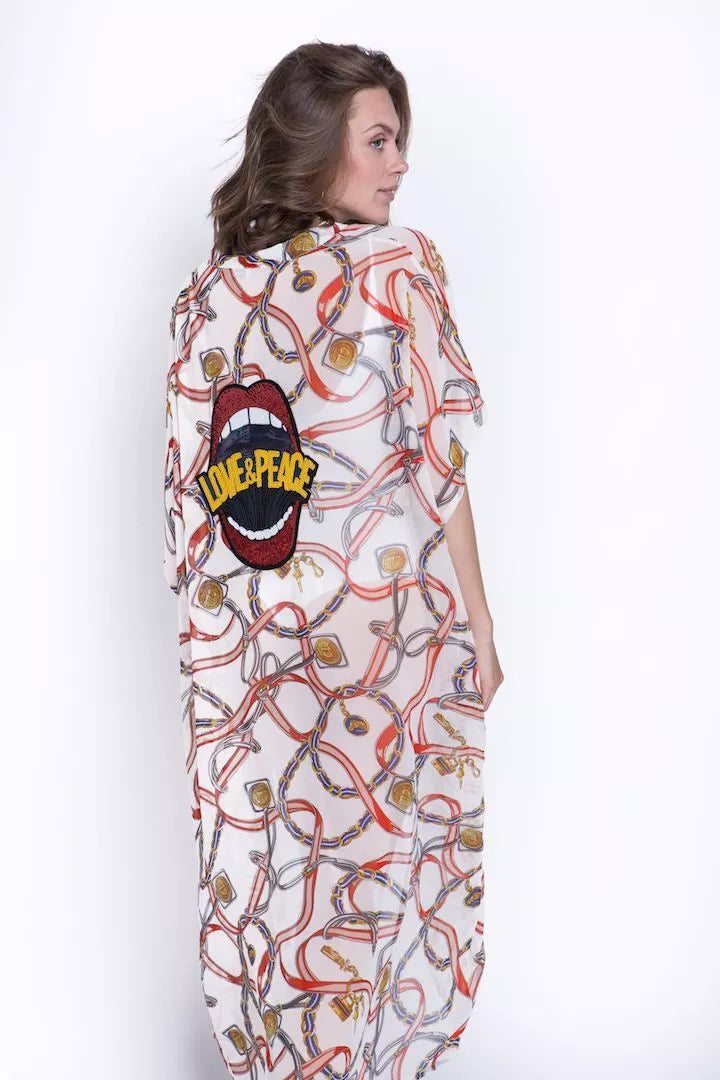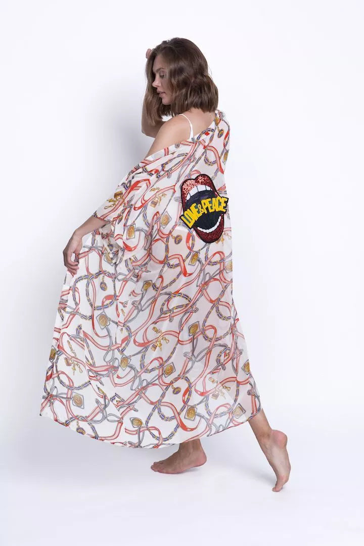 Ar tai būtų smėlėtas paplūdimys, diena prie baseino, savaitgalis festivalyje, o gal, tiesiog – šilta diena jūsų terasoje, šis kimono apgaubs jus unikalia ir žavesio kupina nuotaika. Nenustebkite, jei sulauksite pavydžių aplinkinių žvilgsnių – jūs visai nekalti, tai kimono darbas… Lengvas, vėjavaikiškas ir kiek koketiškas – tokiu virsta jūsų kūnas, pasidabinęs ShaSha prekinio ženklo sukurtu LOVE&PEACE kimono. Blizgi lūpų aplikacija – kiek ekscentriška, tačiau puikiai įsiliejanti į bendrą kimono apsiausto dizainą ir įnešanti išskirtinumo pliūpsnį. Atsipalaiduokite, mėgaukitės saule ir leiskite jūsų odai būti glostomai subtiliai perregimo kimono.