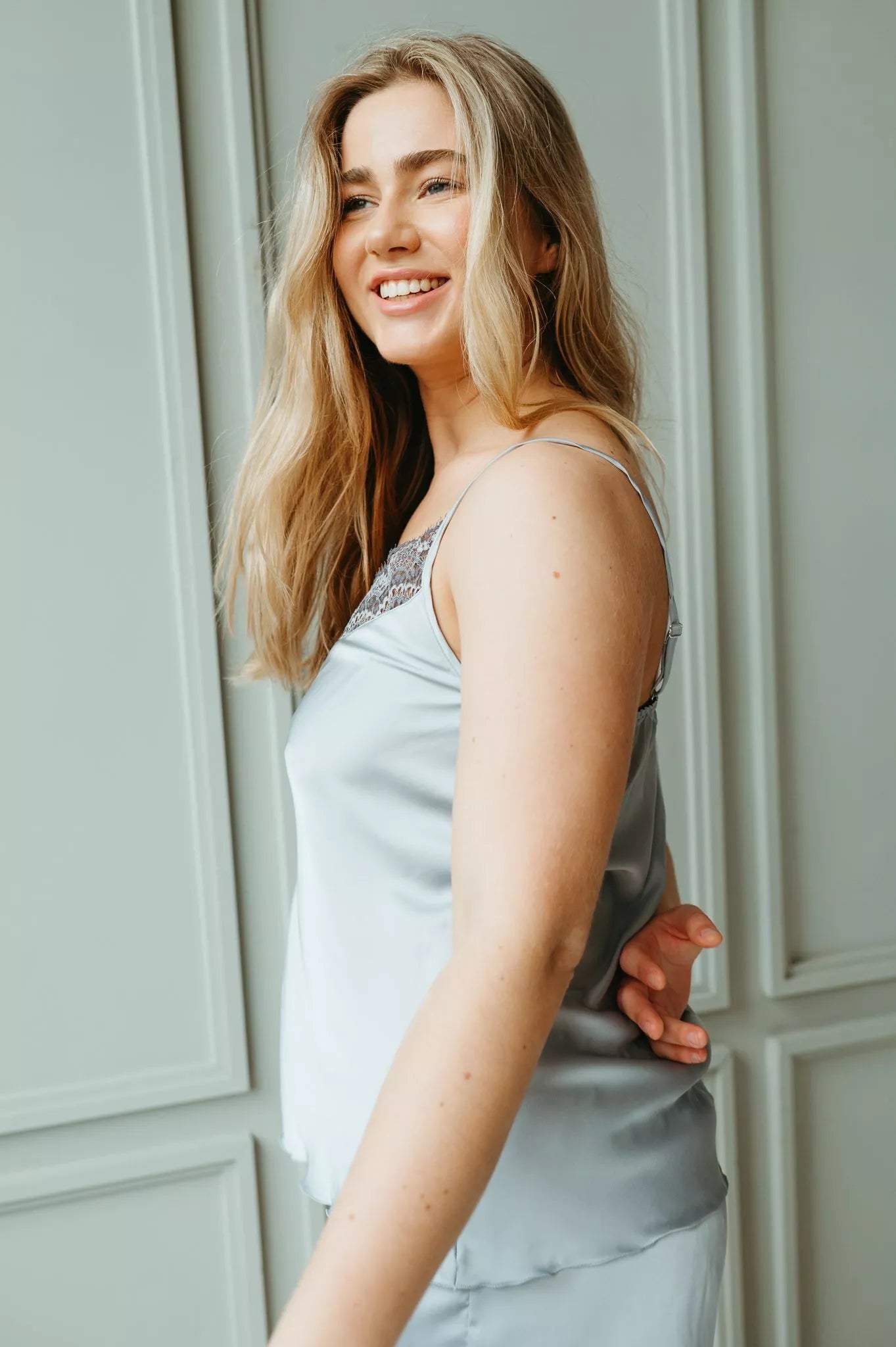 Shasha prabangus ir seksualus ACACIA SS00GY moteriškas pilkas 2 dalių naktinukų komplektas su šilku, nėriniais dekoruoti šortukai ir palaidinė su... Skaityti daugiau
