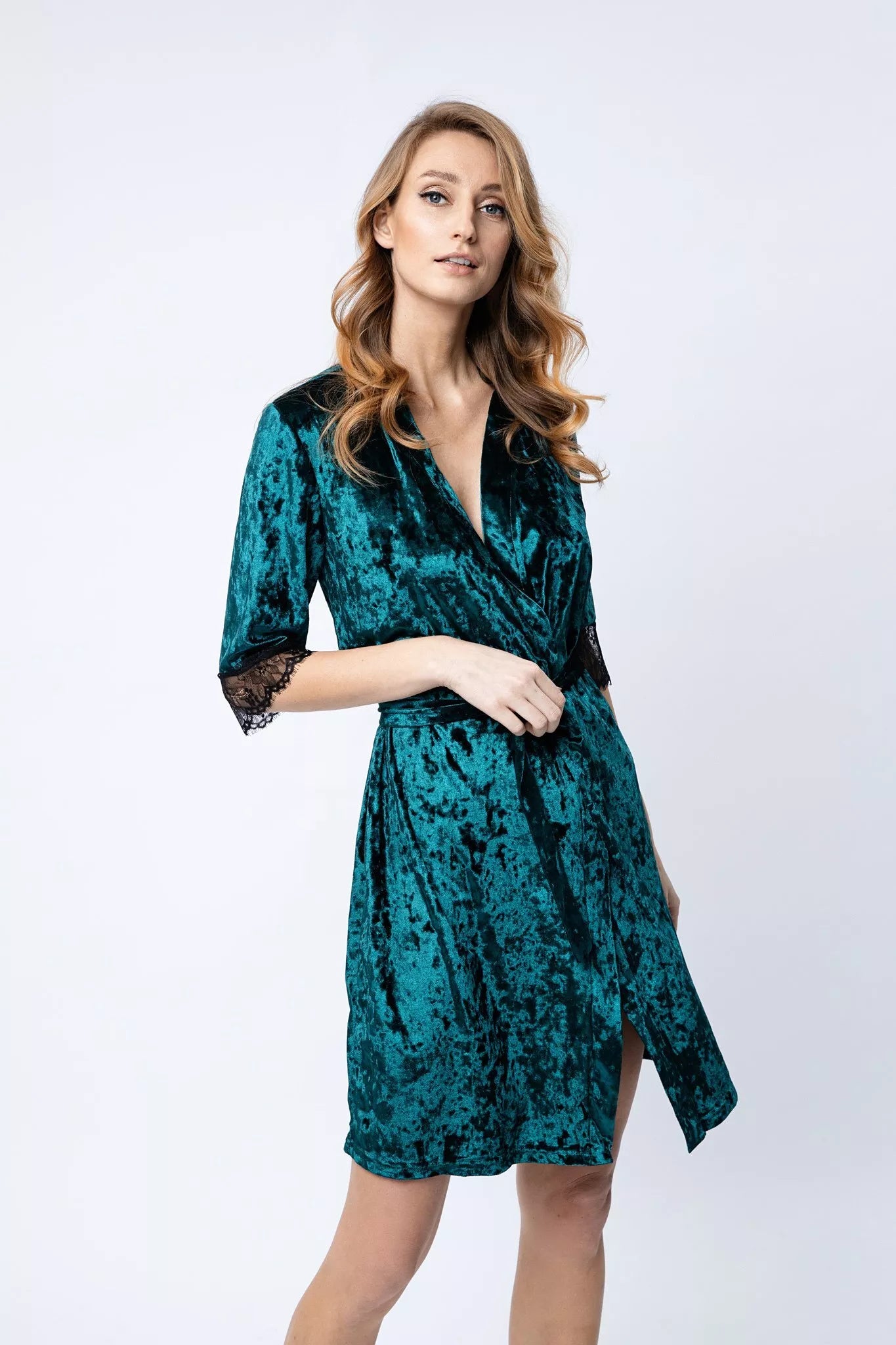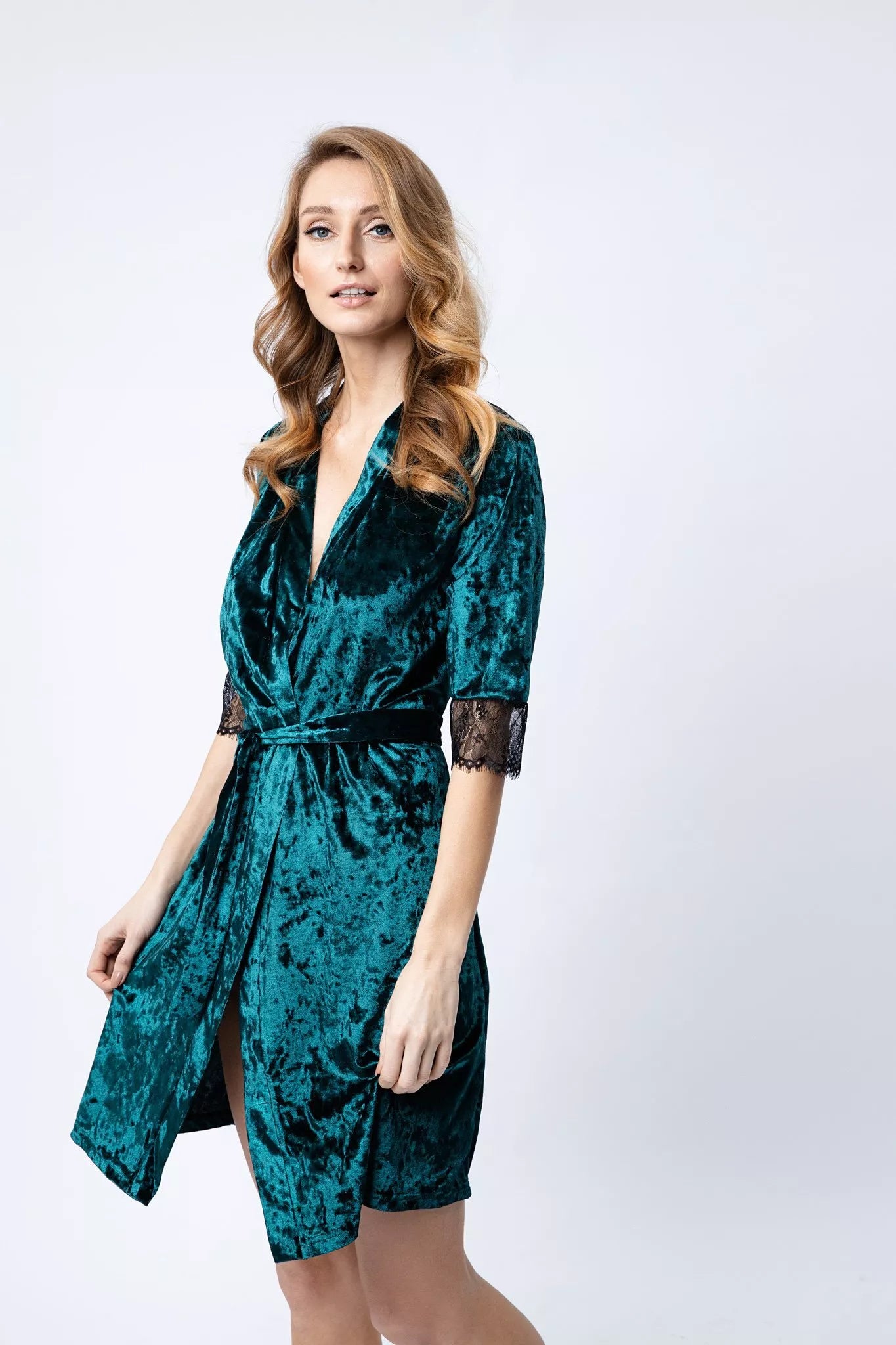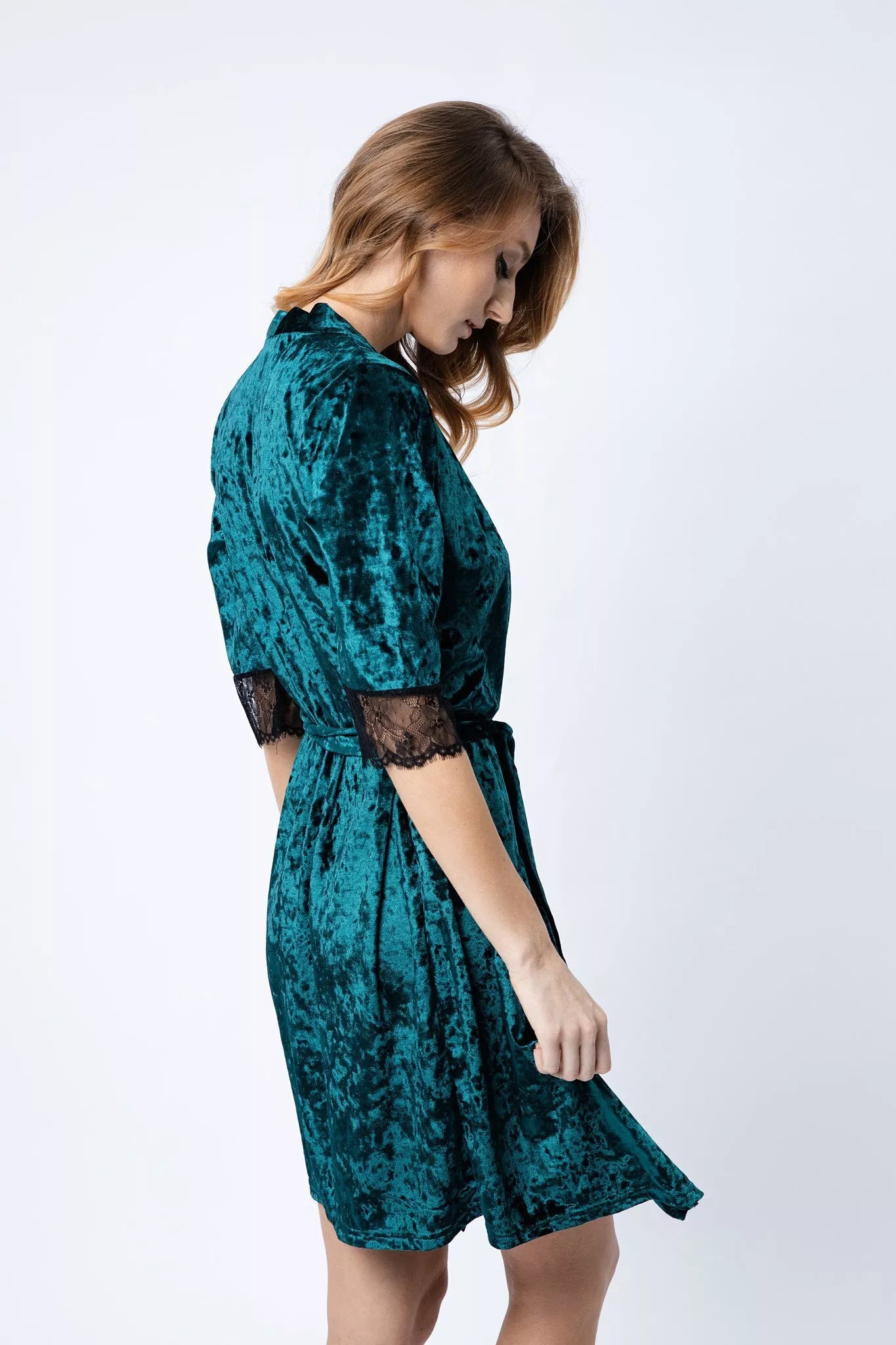 ShaSha žalias veliūrinis chalatas su nėriniais PEONY