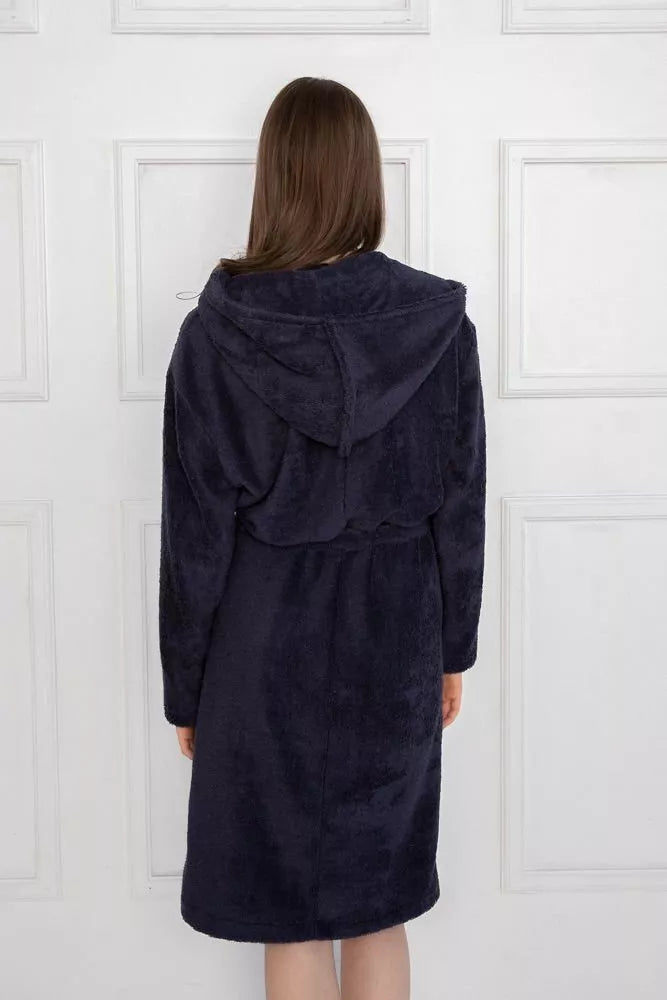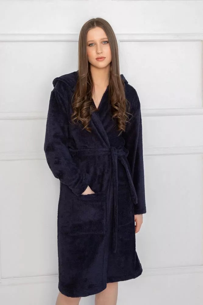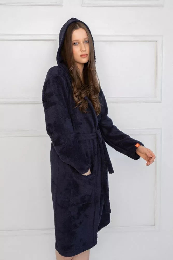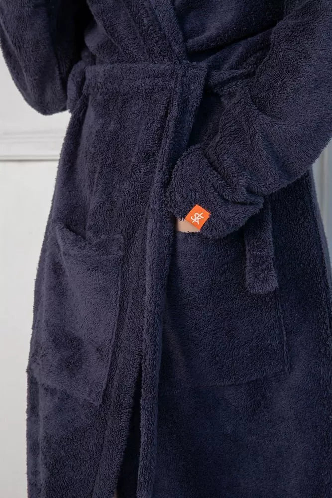 Sofa Killer tamsiai mėlynas frotinis chalatas iš bambuko pluošto, šonuose kišenės. Medžiaga švelni ir jauki, sukuria įpatingą šilumos jausmą ir norą vilkėti chalatą nuolat. Sofa Killer chalatai nevaržo judesių, tad puikiai tinka patogiam poilsiui. Dekoruota Sofa Killer logotipu šone.