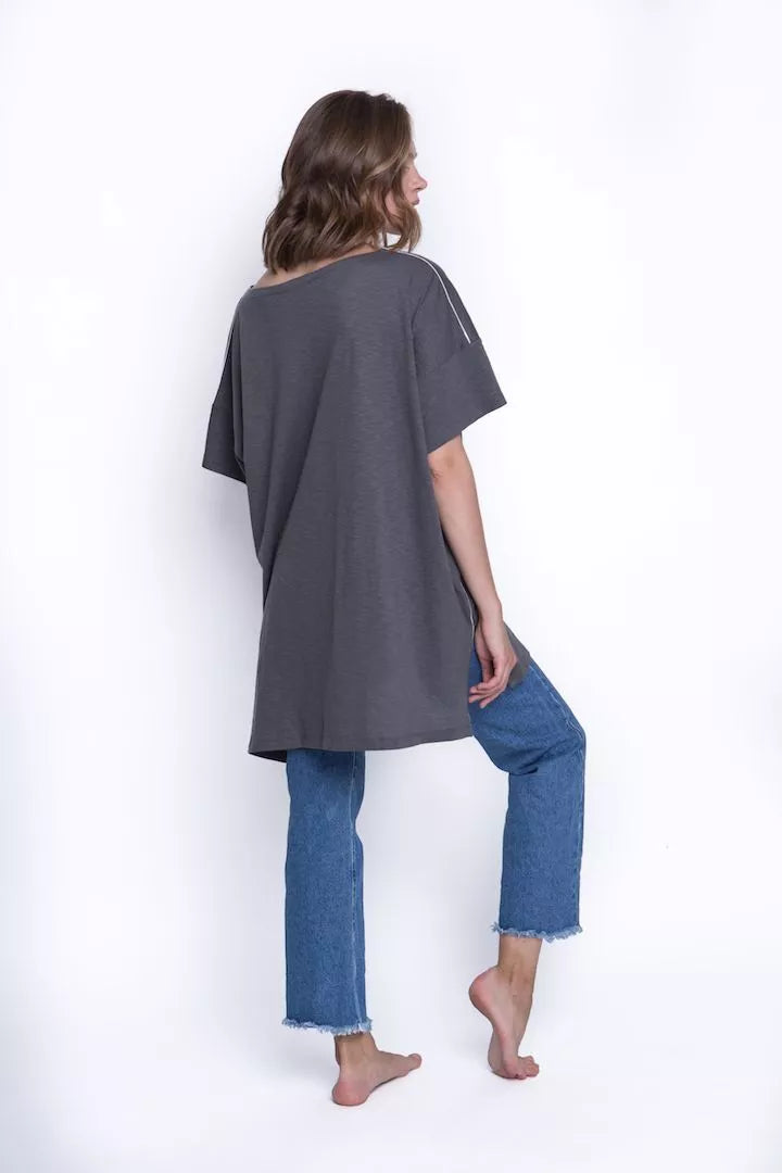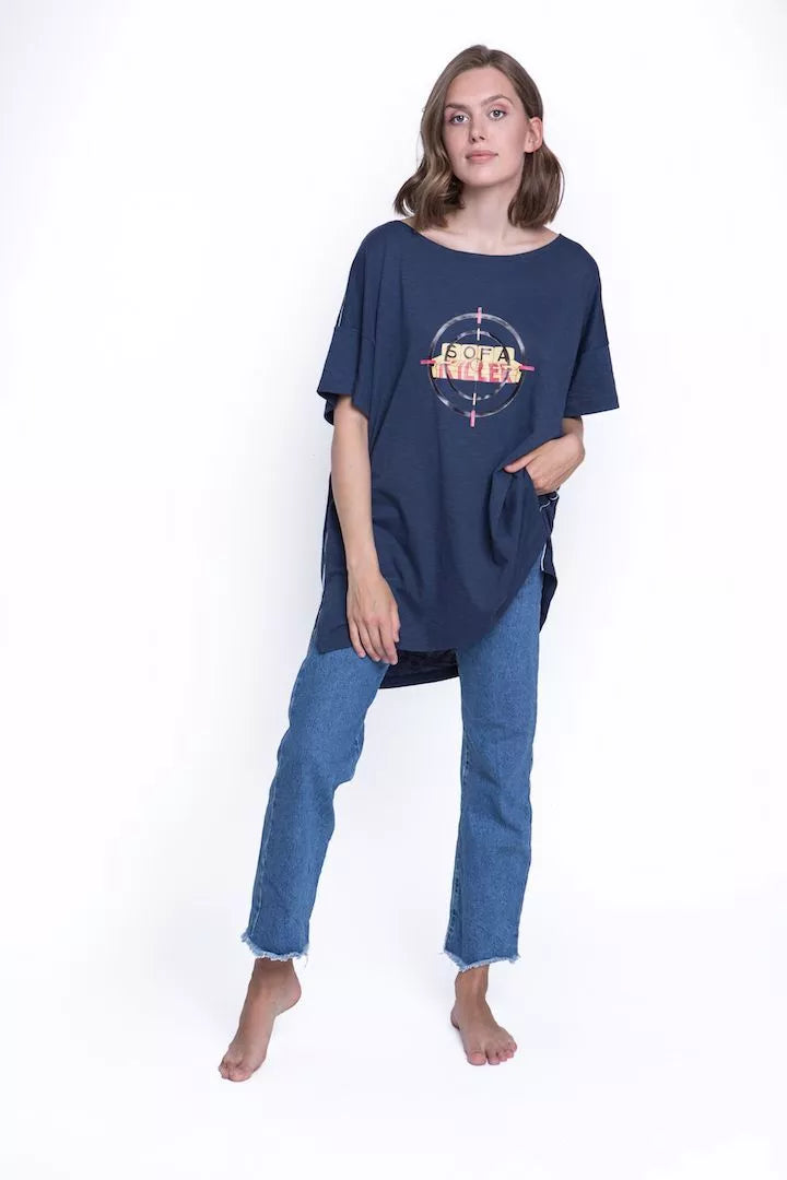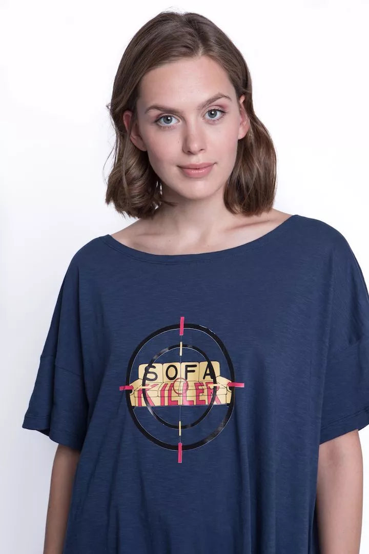 Sofa Killer tamsiai mėlyni medvilniniai marškinėliai su taikinio ir sofos aplikacija ir balta juostele šonuose. Audinys natūralus, minkštas, kaklas platus... Skaityti daugiau
