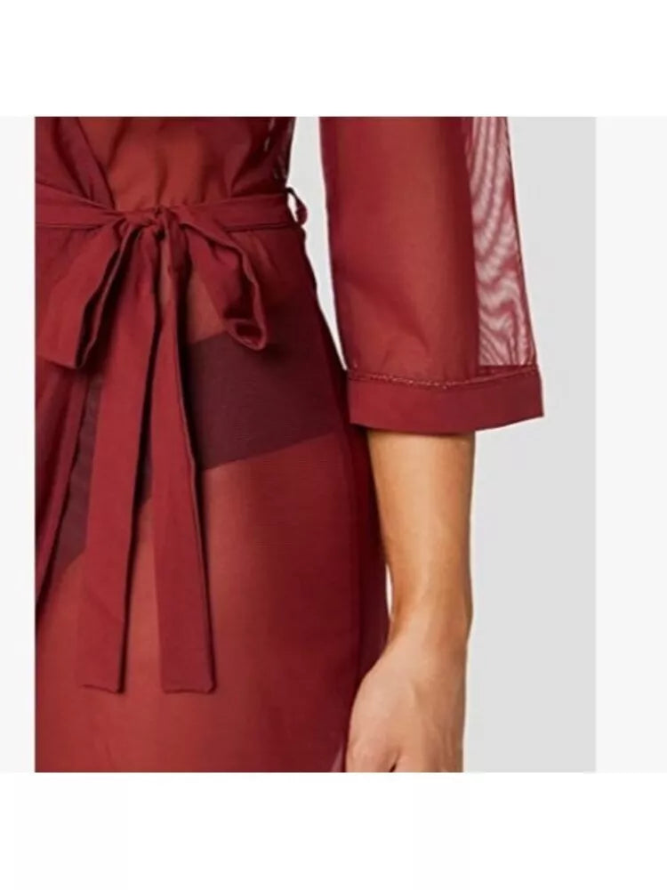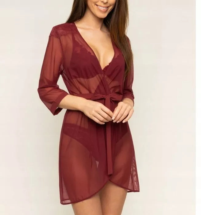 Triumph 36(S) 40(L) dydžio bordo spalvos moteriškas trumpas chalatas Lace Spotlight ROBE 02 .Lengvas ir švelnus kūnui chalatas, juosiamas dirželiu,be kišenių .Perregimo audinio,dekoruotas neriniais,rankovės trejų ketvirčių.Chalatas turi kilpelę nugaros kaklo srityje,todėl patogu pakabinti.Puiki dovana mylimai damai. Sudėtis 82% poliamido ir 18% elastano.Gamintojas Triumph.
